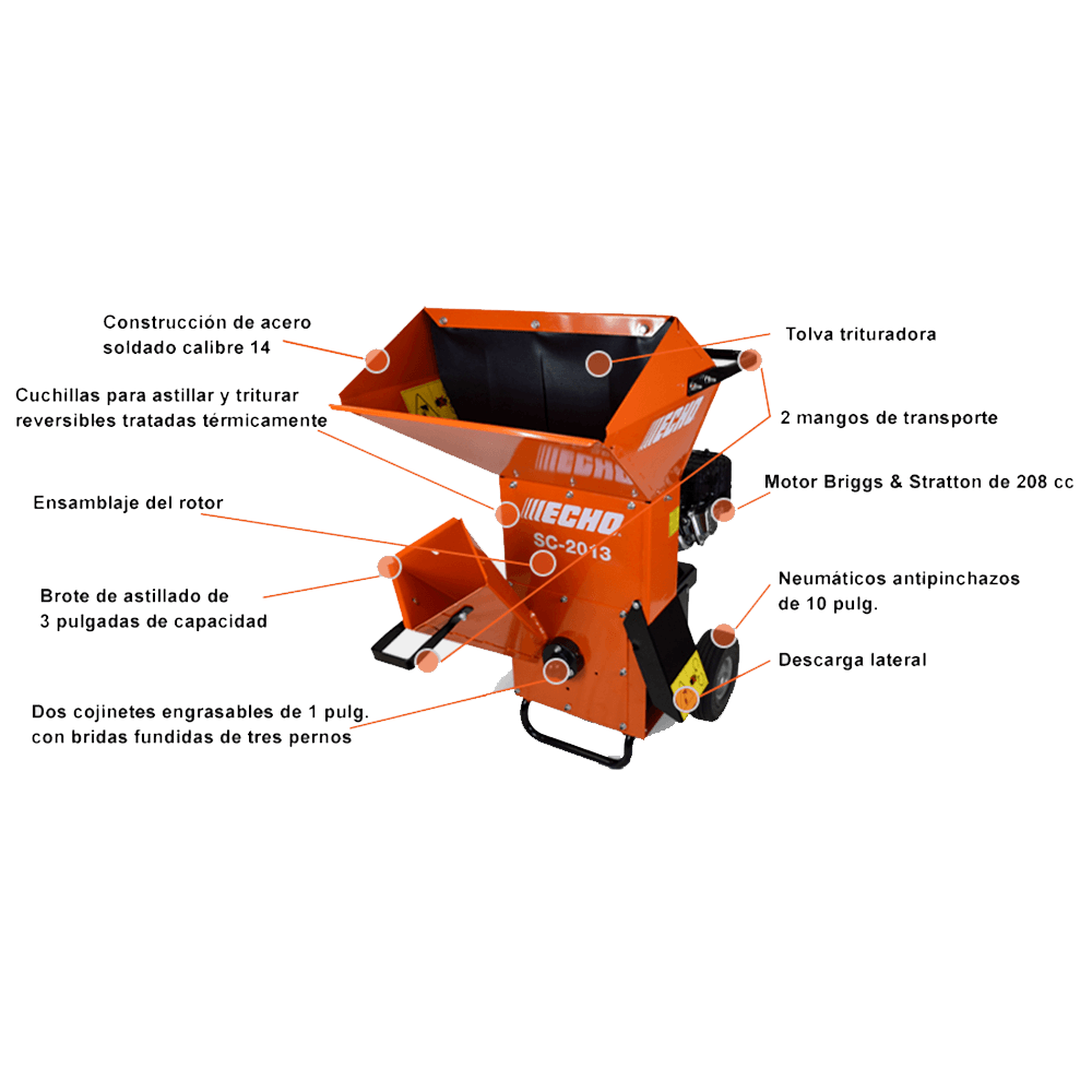 Recicla tus limpiezas. La ECHO SC-2013 es una trituradoras/astilladura fácil de usar, capaz de reducir escombros y ramas de árboles de hasta 3" de espesor a piezas de ¾" que son perfectas para refrescar el paisaje. Disponible con cuatro rejillas de alta resistencia para elegir el tamaño de su astilla.